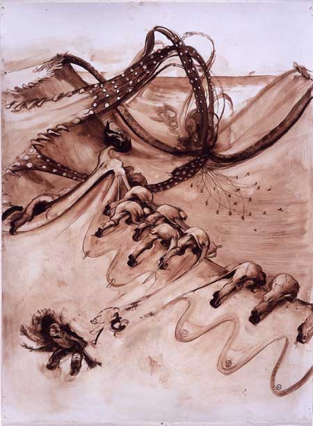 Les phalanges recroquevillées et les ongles recourbés s’affalent sur le corps sibyllin du vieillard. Elle perce sa cuisse d’un poing piquant. La bouche béante, elle suce les pieds jaunis du presque mort. Le corps malingre et blanchâtre de l’ancien est absorbé par l’obscur vide. Les dents contre la faux, il passe ses bras de l’autre côté, à travers les barbelés électriques. Happé dans un trou moelleux, il s’enfonce dans un tube de gel et de feu et gratte contre les parois, en poussant loin de lui ces cloisons étouffantes. Elle avance encore.