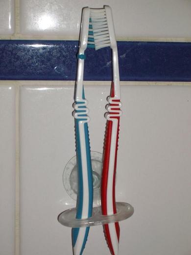 (photo prise par l’ami phoenix dans ma salle de bains, preuve d’une communication dentaire entre mon homme et moi. Blue for him, Red for me)
