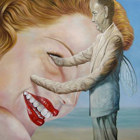 du coup, son oeil, coincé dans le bras qui tombe au sol, fait sourde paupière.