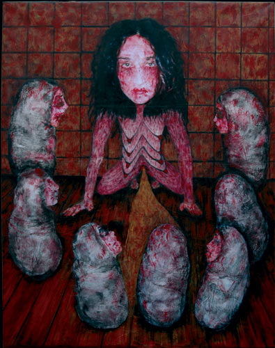 « Le venin biblique flaire l’hérésie sous chaque ombrelle, il se détourne des pleureuses morveuses et capte la fréquence régulière, l’assurance diabolique de l’or païen. Ces rigoles sacrificielles flirtent avec le diable et embrasssent l’intérieur de l’affranchi glorieux. La divinité mûre et emmurée se cache, se contorsionne à l’intérieur de schémas d’angles étranges de petites divinités ovoides indexés entre elles et sèment un individu selon une logique argileuse et fomante ces exigences aquatiques, elle touche les fonctions primaires, cale sa bouche dans l’obscurité et avale son vide. Elle s’entame alors d’un chant barbare, un chant de Lune, de pulpe rouge, un chant ravagé de marées, un chant où la moisson se fait de matière primordiale, où la caresse cosmique embrasse la matrice jugulaire langoureusement et la presse contre elle en décubitus. Et si la matière souffre, la divinité biologique s’en balançe pas mal bien sûr, mais en contraction limpide, parfois fièvreuse, en palette froide sur le visage aérien, mais toujours en silence studieux. Une éminence sanguinaire qui badigeonne les cratères de malédiction pour danaïdes meurtrières. Elle tire sur les tendons, ploie l’inversion, se gaspille, sirote nos présomptions de son magma et digère notre culpabilité en rêveries jusqu’à compulser les jours. Elle décuivre nos corps, déflore l’épine et active la démangeaison protocolaire à recevoir les ovules germes de la divinité biologique. Des larmes polynucléaires qui irradient l’ensemble de frêles secousses stalagmites, les doigts inquiets, les iris citrouilles fixent le bas, la bouche s’inverse. Le Sang est quantique et la respiration est plus que tout métaphysique, les cours d’eau s’entrecroisent, les carrefours fourmillent d’angoisses stupides et la matrice reste pleureuse, la divinité le veut. Et l’on perçoit le voile vagument angoissé des pupilles masculines mais l’iris brûlante pose la question, quel peut-être le goût de ce puits pourpre d’Inconscient pur… »