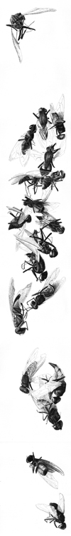 La première mouche étale ses pattes contre la glaire rouge, elle pompe l’odeur âcre du dépassement, le fer l’enivre. Il la saisit promptement, aisément, chastement. La mouche est alourdie de son butin, regorgeant de son dernier festin.