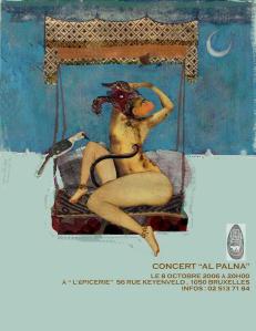 Avec Bert Cornelis au sitar (élève du maître Pandit Ashok Pathak), Ghalia compose et improvise sous le nom de » Al Palna « (le berceau). Berceau d’où ils unissent et fondent les sons arabes et indiens en une combinaison originale pour créer un dialogue oscillant du mystique au pétillant… Une musique qui nous ballade entre extase et méditation. Pour ce concert d’exception, ce 8 octobre, ils se joindront à Prahbu Edouard, maître du tabla, disciple du légendaire Shankar Goshn un des plus talentueux joueurs de tablas du continent Européen. C’est « A l’épicerie », chez Mongkon, lieu richement insolite et intime que se produira ce concert … à ne pas manquer! Vous pourrez également déguster des tartes salées sucrées et autres douceurs à boire et à manger .. Concert « Al Palna » Le 8 octobre 2006 à 20h00 A » l’épicerie « , 56 rue Keyenveld 1050 Bruxelles Entrée : 10 Euros Places limitées, réservation vivement souhaitée au O2 513 71 84 0473 325 876 »