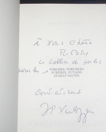 et là, l’autographe à Milady la vile de la part de l’homme (qui cita Arthur Cravan & Jacques Rigault, bien entendu!) qui m’a pourchassée avec ses écrits païens et violents.