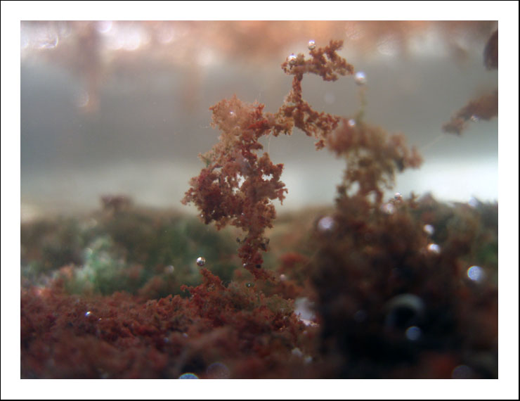 Le corail-coeur, lui, vestige d’une saine incertitude, couché dans la cale du ventre, craquelé de rouge cruor, veiné d’algues inertes, tout avarié, sali, dévié, il s’écarte dans l’eau, sans se dissoudre vraiment (encore). Il diffuse une vague-furie au compte-gouttes, dans cette canule omnisciente, seule juge de nos actes caverneux.