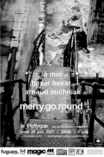 merry.go.round jeudimerry.go.round evening, troisième acte et feux d’artifices annoncés pour clore ce tryptique… au Triptyque : imaginons ainsi de la neige en été comme au temps du #3 de Diabologum, des mots pleins de bleus, à vif, électriques (à Moi, échappée inédite des guitares d’Innocent X), des plages ambiantes passionnantes (l’Amérique enfin rêvée de Bexar Bexar) ou le poing perdu d’Arnaud Michniak, nouvelle secousse en solitaire après les séismes que furent Programme ou Diabologum.