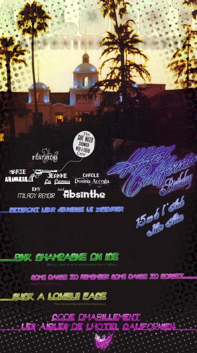 Invitation universelle à la Soirée Anniversaires de plusieurs Sistoeurs: Absinthe (la plus chanteuse née un 24/02: http://www.myspace.com/electrozombification), Arimata (la plus fleuriste née un 19/02: http://catscradle.canalblog.com/), Milady (la plus vieille née un 13/02: http://miladyrenoir-et-son-autre-oeil.skynetblogs.be/) + 2 autres consoeurs parisiennes toutes aussi coruscantes, soit 5 filles exceptionnelles ce samedi 23 février, from dusk till dawn, ou du crépuscule à l’aube, à Paris (ATTENTION, NOUVEAU LIEU, le squat loft du métro Alésia prévu depuis des semaines ayant été réquisitionné ce matin (6h54) par les forces de l’ordre parisiennes (même pas drôle, toute la déco préparée depuis deux semaines… pffffft!), la soirée aura donc lieu au 6 rue Saint Maur, Métro Voltaire… Du métro Alesia (une défaite), nous passons à Voltaire (mieux que Rousseau) donc tout est pour le mieux!! Alors, rabotez vos baskets, on va guincher à Saint Maur, dans le 11ème! N’oubliez pas une (ou plus) bouteille(s) de rhum (pour le Punch géant) ou toute autre bouteille de circonstance… Le dress code est Les Eagles ou toute incohérence d’un Hotel California mais tout autre accoutrement est valide. Là bas, pour vous, des performances, des musiciens, des DJ fulgurants, une faune étincelante…VOUS ÊTES CONVIé(e)s, avec votre bouteille de rhum (des femmes ou de la bière, nom de dieu), vos amis (imaginaires ou pas) et votre éternelle joie de vivre! Pour les réminiscences, les chorégraphies et les efforts, une assistance visuelle: www.youtube.com/watch?v=vPIuIwSJ41s & On a dark desert highway, cool wind in my hair Warm smell of colitis rising up through the air Up ahead in the distance, I saw a shimmering light My head grew heavy, and my sight grew dimmer I had to stop for the night There she stood in the doorway; I heard the mission bell And I was thinking to myself, ‘This could be Heaven or this could be Hell’ Then she lit up a candle and she showed me the way There were voices down the corridor, I thought I heard them say… Welcome to the Hotel California Her mind is Tiffany-twisted, She got the Mercedes Benz Welcome to the Hotel California Mirrors on the ceiling, the pink champagne on ice |