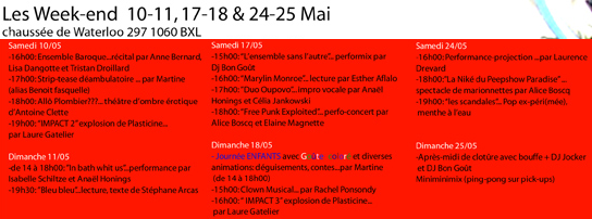 Cette exposition-décrémaillère est l’occasion de proposer une carte blanche aux nombreux intervenants pour investir tout l’espace. Cela se comprend avec des installations, sculptures, photos, vidéos, court-métrage… et sous forme d’événements qui auront lieu le samedi et parfois le dimanche aux alentours de 16h et/ou 18h (performances, théâtre, concerts…+ bar à cocktail dans le jardin jusqu’à 21h00 le samedi).