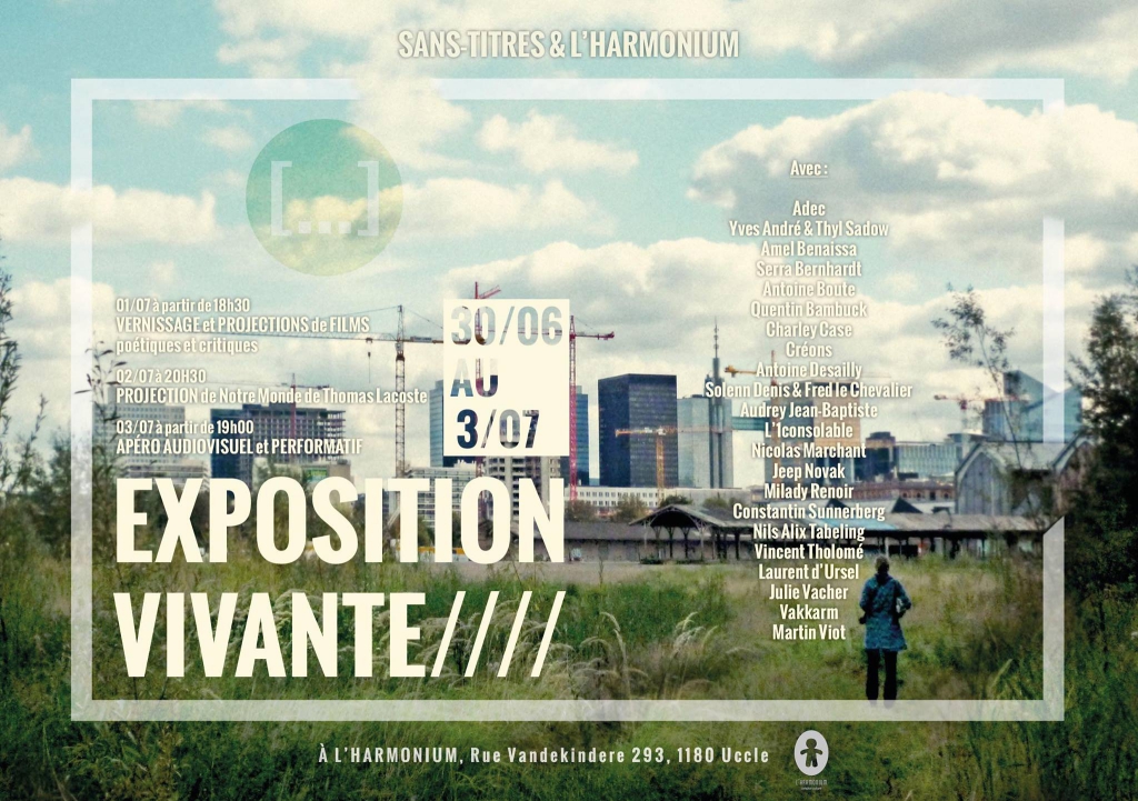 La REVUE Sans-Titres, à laquelle Nicolas Marchant et moi avons contribué, propose ce soir une soirée micro-anthologie de l’usage de la parole poétique dans la performance (rien que ça!), avec une alternance de SONS (textes enregistrés et mis en scène sans présence humaine : Quentin Bambuck et Milady Renoir), de VIDEOS où la parole est la matière principale (Laurent D’Ursel, Julie Vacher, Vakkarm), et d’INTERVENTIONS physiques et vocales (Antoine Boute, Vincent Tholomé&Benjamin Pottel, Amel Benaissa) + une petite vidéo de clôture de Charley Case, muette.