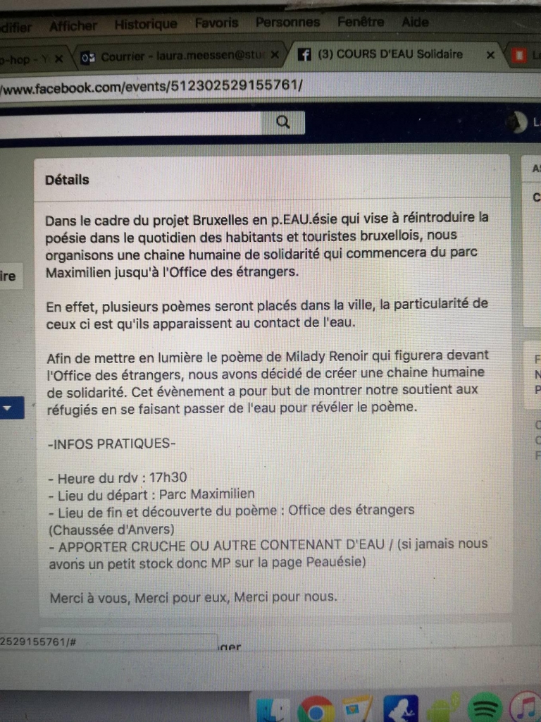 Demain, mercredi, à 17h30, devant l’office des étrangers, Ali Talib, réfugié irakien lira en arabe, Aliette Griz, soutien des réfugié.e.s et sans papiers, co-écrivaine du récit d’Ali, Mom, I’m a refugee, lira en anglais, et Milady Renoir, poétesse solidaire, lira en français tandis qu’on fera apparaître ce poème, encore et encore, sous l’eau.