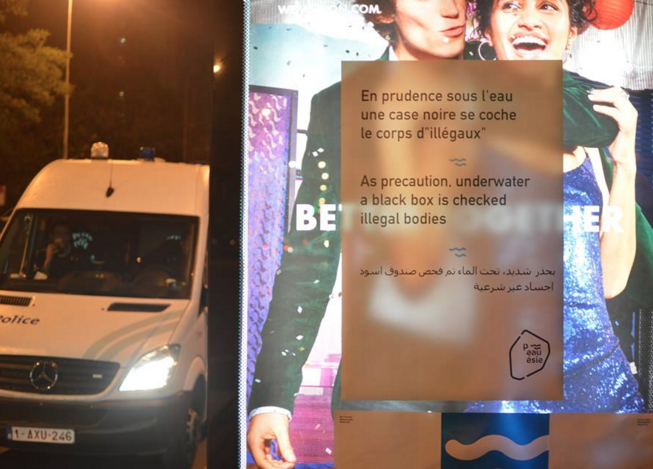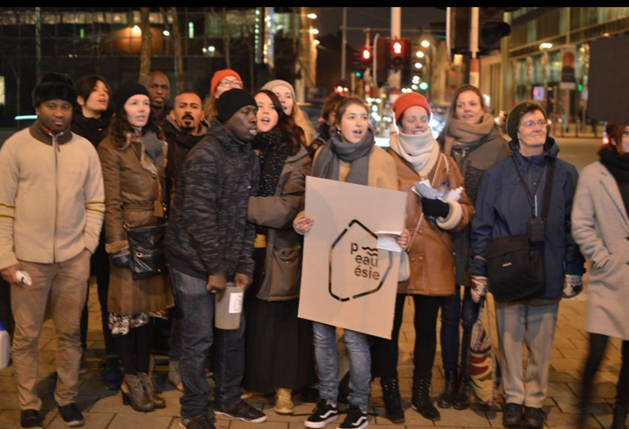 Dans le cadre du projet Bruxelles en p.EAU.ésie qui vise à réintroduire la poésie dans le quotidien des Bruxellois, un premier poème qui se révèle sous l’eau a été inscrit mercredi à 17h30 sur un trottoir à proximité de l’Office des étrangers, en solidarité avec les migrants.