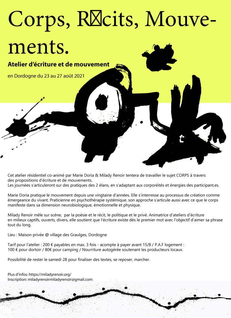 Ecritures : Les propositions s’appuieront sur des textes d’auteur·trice·s (créatifs, théoriques, empiriques, poétiques…) et des approches du corps raconté, imaginé à travers les âges, d’autres arts, des points de vue des participant·e·s, sans hiérarchie, sans chichi. Chacun.e pourra y apporter ses doutes, ses élans, ses pages blanches et ses stylos, même rouges. Des retours sur les textes seront exploités pour retravailler les textes, peaufiner son style, expérimenter d’autres nuanciers. Cet atelier d’écritures créatives s’ouvre aux débutant·e·s et aux endurci·e·s à partir du même point de départ: le désir d’écrire.