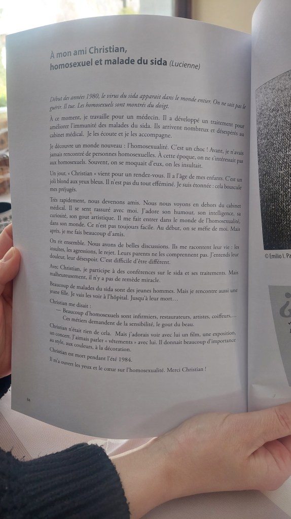 Lucienne a lu un texte personnel dans le cadre d’un des projets d’Ages et Transmissions. Elle raconte sa rencontre et son amitié avec Christian et sa prise de conscience face à l’épidémie du Sida et l’homosexualité plus que touchée dès le départ, et comment les lieux dits « de soin » ont mis trop de temps à appréhender la mortalité et l’étendue des dangers. Lucienne travaillait avec un médecin dont l’approche a surtout beaucoup calmé les personnes déjà malades à envisager leurs corps et la mort avec un peu moins de souffrance, au milieu d’une société tellement discriminante. Encore aujourd’hui? Cette publication invite aussi les personnes qui découvrent certaines réalités de la Belgique à engager le débat.