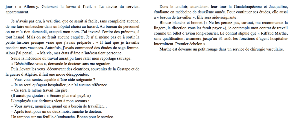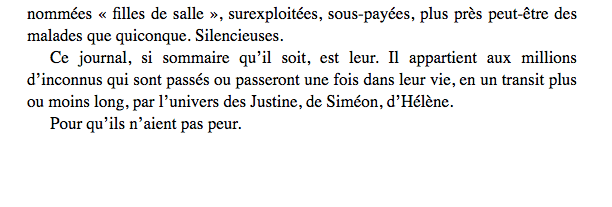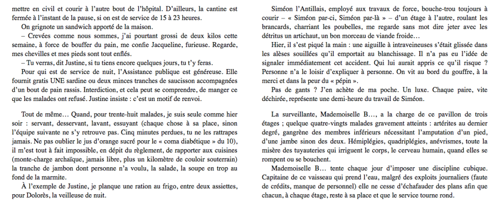 Les Linges de la nuit est un best-seller qui a marqué son époque en dénonçant les carences du système hospitalier français. Bien plus qu’un reportage, il est le témoignage d’une journaliste qui, pour parler au mieux de son sujet, passe de l’autre côté du miroir. En se faisant engager incognito comme agent hospitalier, Madeleine, devenue Marthe pour l’occasion, découvre et révèle (ou plutôt dénonce) le pire : besognes répugnantes, salaires dérisoires, manque de moyens et de personnel, souffrances physiques et morales… Mais elle évoque aussi les liens de tendresse qui se nouent entre soignants et soignés, le dévouement quotidien et les gestes de délicatesse que le métier suppose, la patience, le courage de certains face à la mort…
