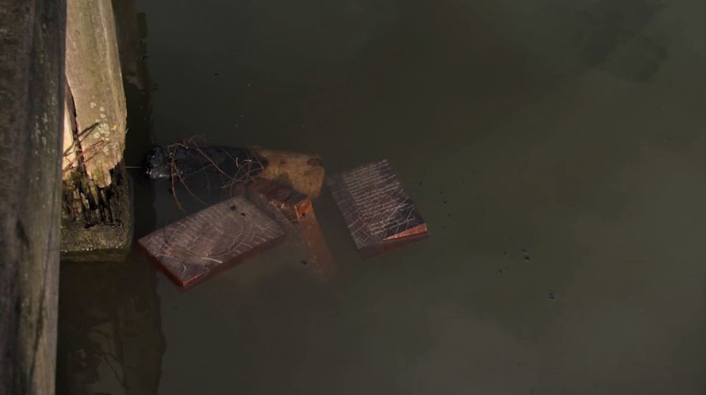 Pas d’inquiétude, la sculpture est néanmoins immergée, son texte, gravé dans du bois d’Azobé, imputrescible,(qui normalement coule, on l’appelle le bois de fer) est là pour longtemps, et comme j’ai rempli la gravure d’argile crue, le texte se dilue, se répand, infuse dans la géographie bruxelloise, belge, européenne.